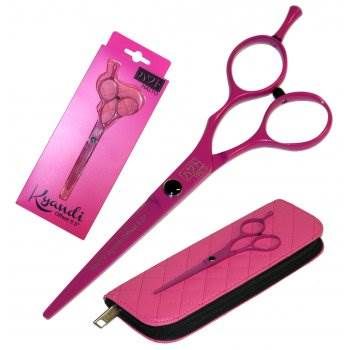 Hand-Made Scissors From Stainless Steel, With Pink Teflon Coating. Offset Handle For Comfortable Working Position. Convex Cutting Edge For Professional Cutting - Supplied With A Removable Finger Rest And Finger Rings.