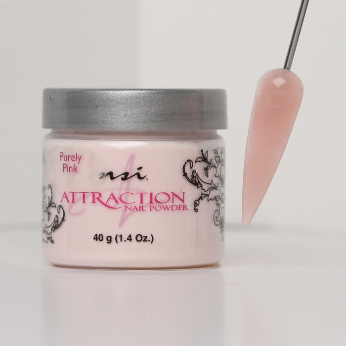 The NSI Attraction Purely Pink Acrylic Powder is a must have, semi-translucent warm pink powder used to create natural-looking pink and white acrylic nail enhancements.