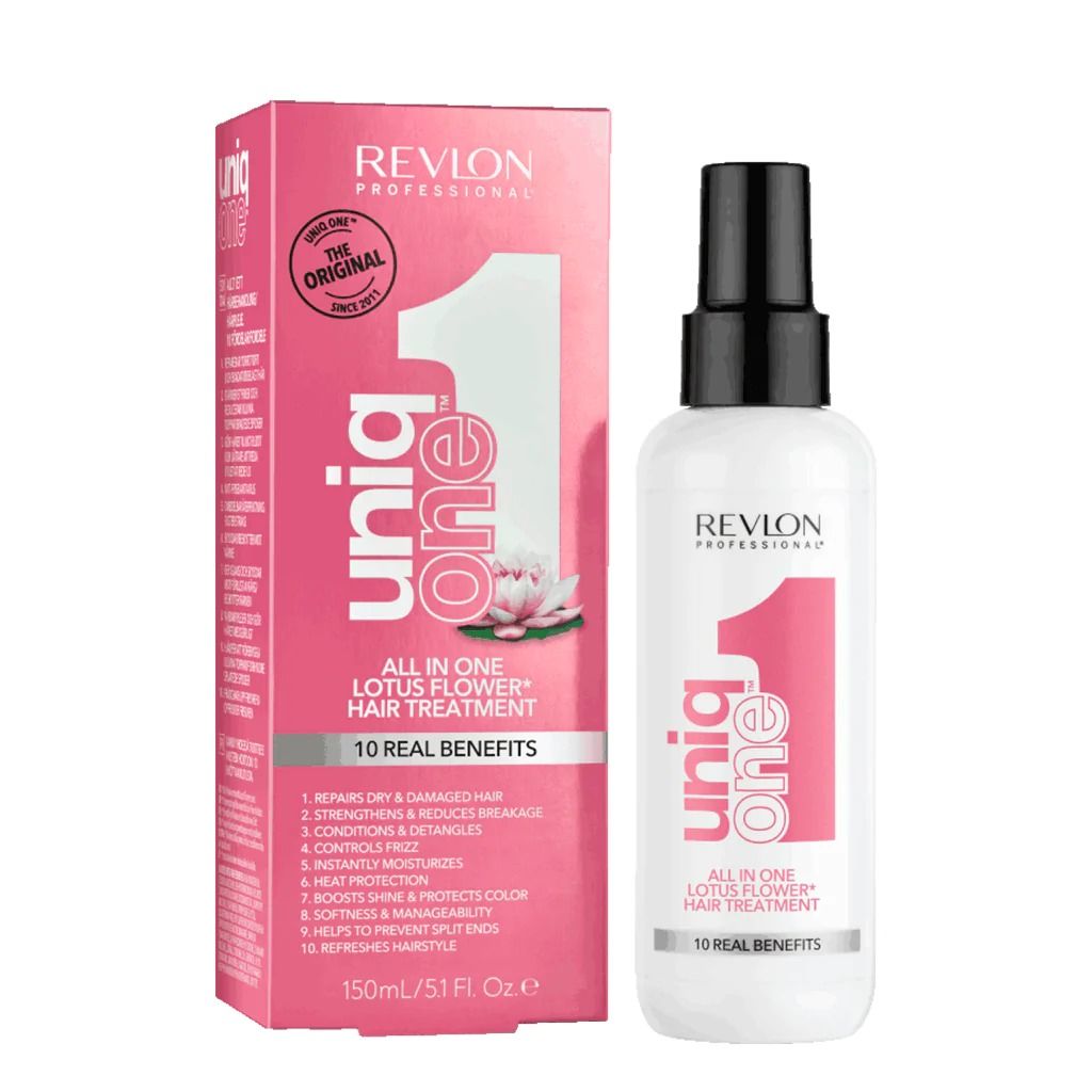 Revlon Professional Uniq One Lotus Hair Treatment is a multi-benefit leave-in hair treatment that has revolutionised the salon market worldwide featuring 10 benefits in one spectacular leave-in product. UniqOne Hair Treatment can do its wonders anywhere and at any time. Features a fresh, pure, soft and floral fragrance inspired in the lotus flowers delicate perfume. Repairs dry and damaged hair, strengthens and reduces breakage, conditons and de-tangles, controls fizz, instantly moisturises, provides heat protection, boosts shine and protects colour, creates softness and manageability, helps to prevent split ends and refreshes hairstyle.