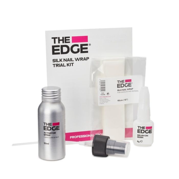 The Edge Silk Wrap Trial Kit The perfect way to try out The Edge Silk Wrap system. Can be used to strengthen natural nails or over nail tips to give extra length to the nail. A handy trial kit, to help you create beautiful Silk Wrap nails. Kit Contains: 1 x 50ml Activator Spray 1 x 8g Brush on Resin 1 x Silk Nail Wrap 46cm (18")