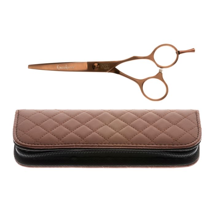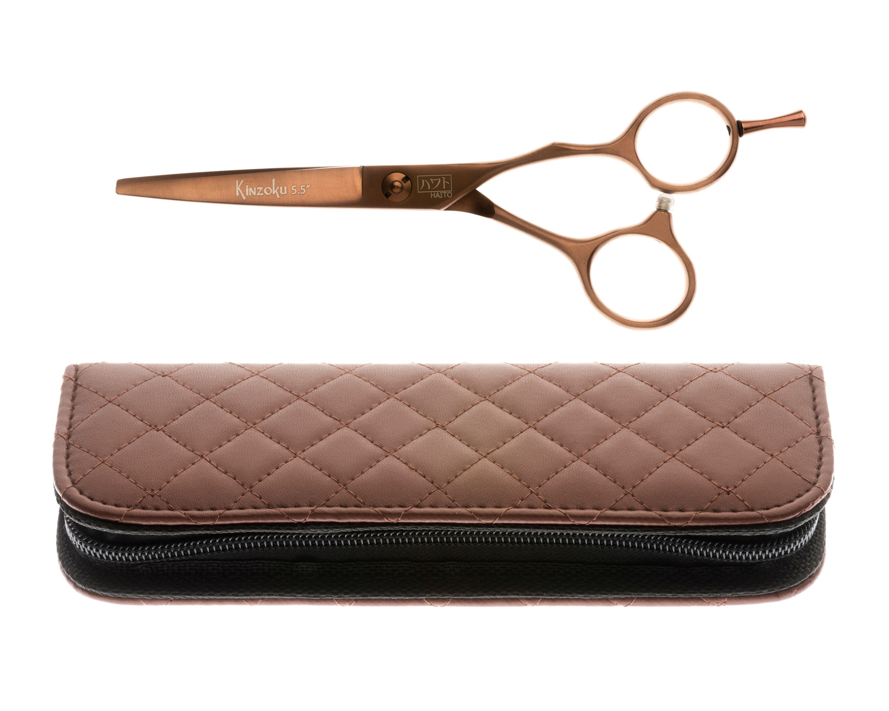 Handmade from stainless steel with a satin copper titanium coating offset handle and a convex cuttng edge for a smooth , precise , sharp and professional cutting and slicing . supplied with a quilted scissor wallet , a removable finger rest and finger rings