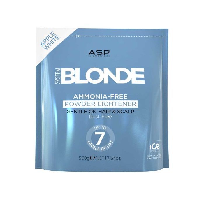 System Blonde Powder Lightener is a high performance, ammonia-free powder lightener, perfect for both on or off-scalp lightening techniques. The gentle, yet powerful formula is much kinder to the hair, producing less swelling, porosity and damage, whilst achieving up to 7 levels of lift. System Blonde Powder Lightener does not contain any odorous ingredients, allowing the use of delicate Apple and Fresh Mint fragrances. The dust-free formulation mixes to a creamy consistency for easy application and does not dry or flake during the lightening process. System Blonde Powder Lighteners incredible lifting ability means it should be used with much lower volumes of developer – achieve levels of lift with 3% (10vol) and 6% (20vol), that would normally be associated with using 9% (30 vol) and 12% (40vol) with traditional bleaches. For on scalp use, we recommend that only 3%(10vol) is used.
