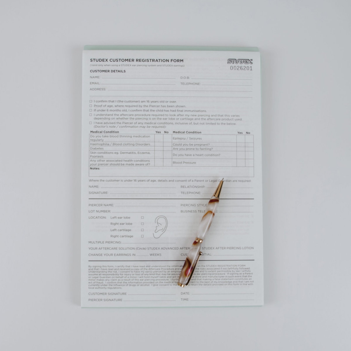 An integral part of the piercing process to record information, check suitability for the piercing and to provide your customer with the correct After Care procedure to look after their new piercing.